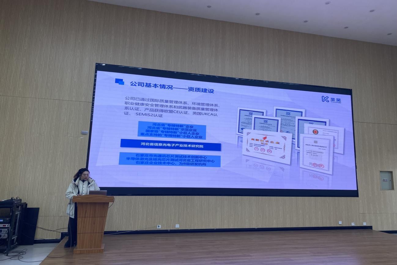 河北圣昊光电人力资源部经理胡媛媛女士作为主讲嘉宾,通过详实的视频资料和生动的PPT演示,全方位展示了企业的硬核实力。她介绍,圣昊光电科技有限公司总部位于石家庄,是一家专注于光通信芯片生产及关键设备研发制造的国家级“小巨人”企业。公司自成立以来,始终坚持自主创新,成功攻克了光芯片自动化测试、划片、裂片等“卡脖子”技术,打破了国际垄断,填补了国内空白。特别是企业近年来将人工智能技术深度融入生产流程,研发出的AI芯片四面自动光学检测(AOI)设备,检测效率提升了300%,处于行业领先地位。胡经理的介绍让在场学子深刻感受到民族科技企业的崛起力量,现场民族自豪感与科技使命感油然而生。
