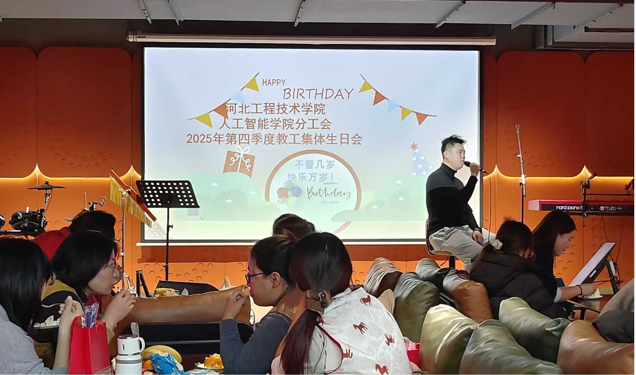 为增加活动的趣味性和互动性,分工会还精心策划了轻松愉快的游戏环节。“看图猜台词”环节,一张张熟悉的影视剧截图引发了老师们的热烈讨论和抢答,现场瞬间变成了一场关于经典记忆的趣味比拼。“听歌识曲”环节更是精彩纷呈,当熟悉的旋律响起,老师们或凝神思索,或脱口而出,掌声与欢笑声此起彼伏。游戏互动不仅考验了老师们的反应速度和知识储备,还在欢声笑语中进一步拉近了彼此的距离。此外,学院教师刘文龙、索昕宇和樊家琦三位老师特别登台,为寿星们献上了一首首动听的歌曲。他们用优美的歌声传递祝福,温暖的歌声与真挚的情谊在会场内回荡。