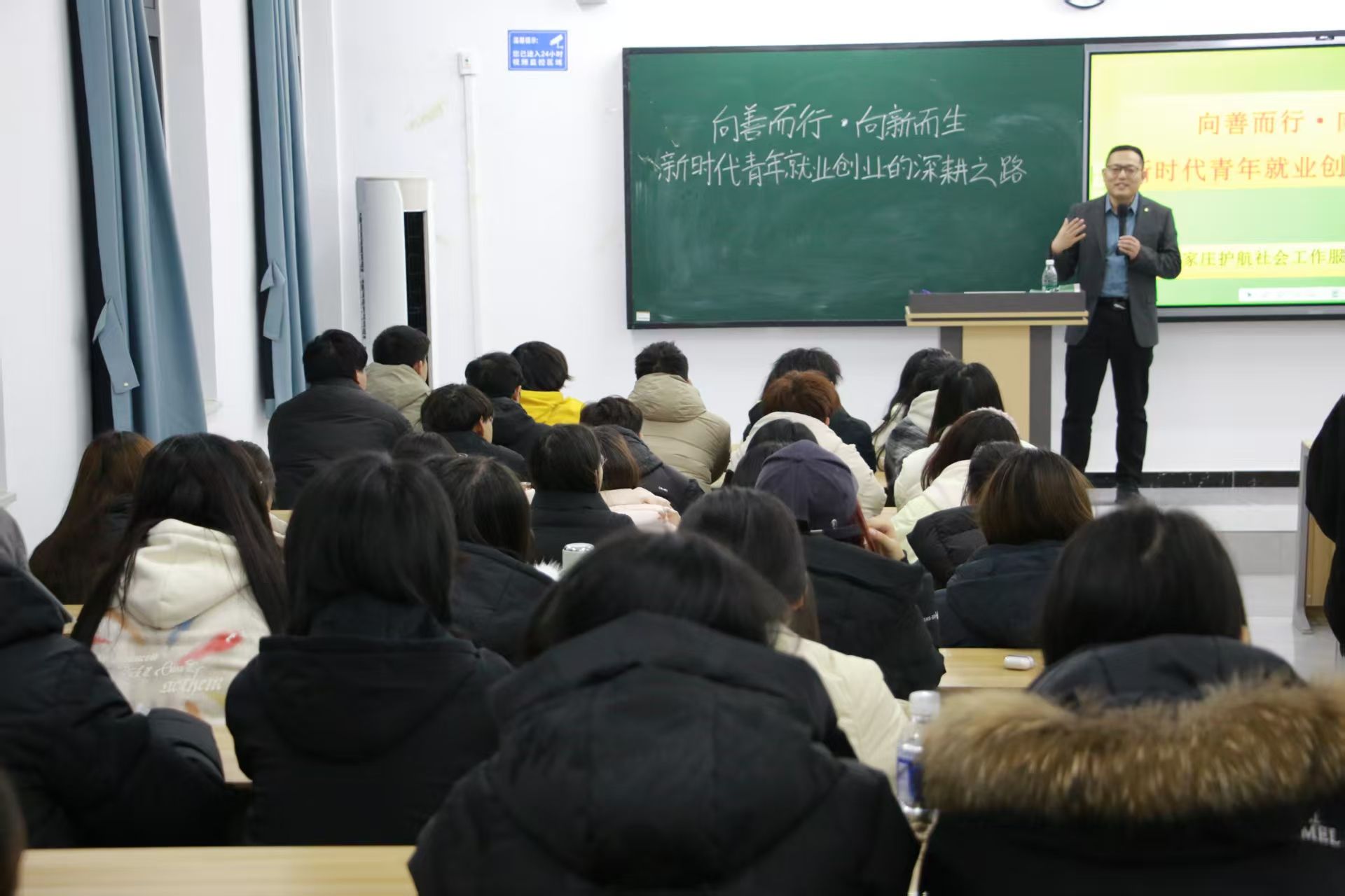 为深化产教融合、精准拓宽毕业生就业渠道,2025年12月15日,m88特邀石家庄护航社会工作服务中心主任张海忠,来校开展“向善而行·向新而生:新时代青年就业创业的深耕之路”主题宣讲暨招聘活动。作为高级社会工作师、全国向上向善好青年,张海忠此行不仅带来了行业前沿的就业分析,更代表企业释放了明确的用人需求信号,为我院毕业生带来了一场干货满满的求职指导与招聘盛宴。