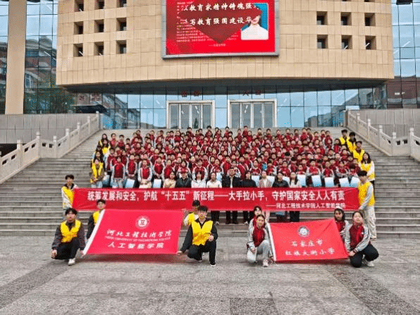 m88于2026年4月16日在8号教学楼前开展“大手拉小手”国家安全教育活动。m88党总支书记、学管副院长尹钧,团总支书记王凤,石家庄市红旗大街小学教育处副主任陈晓楠及五年级全体师生出席活动,m88学生志愿者团队全程参与,红旗大街小学全体五年级学生受邀走进大学校园,沉浸式学习国家安全知识、感受高校育人氛围。