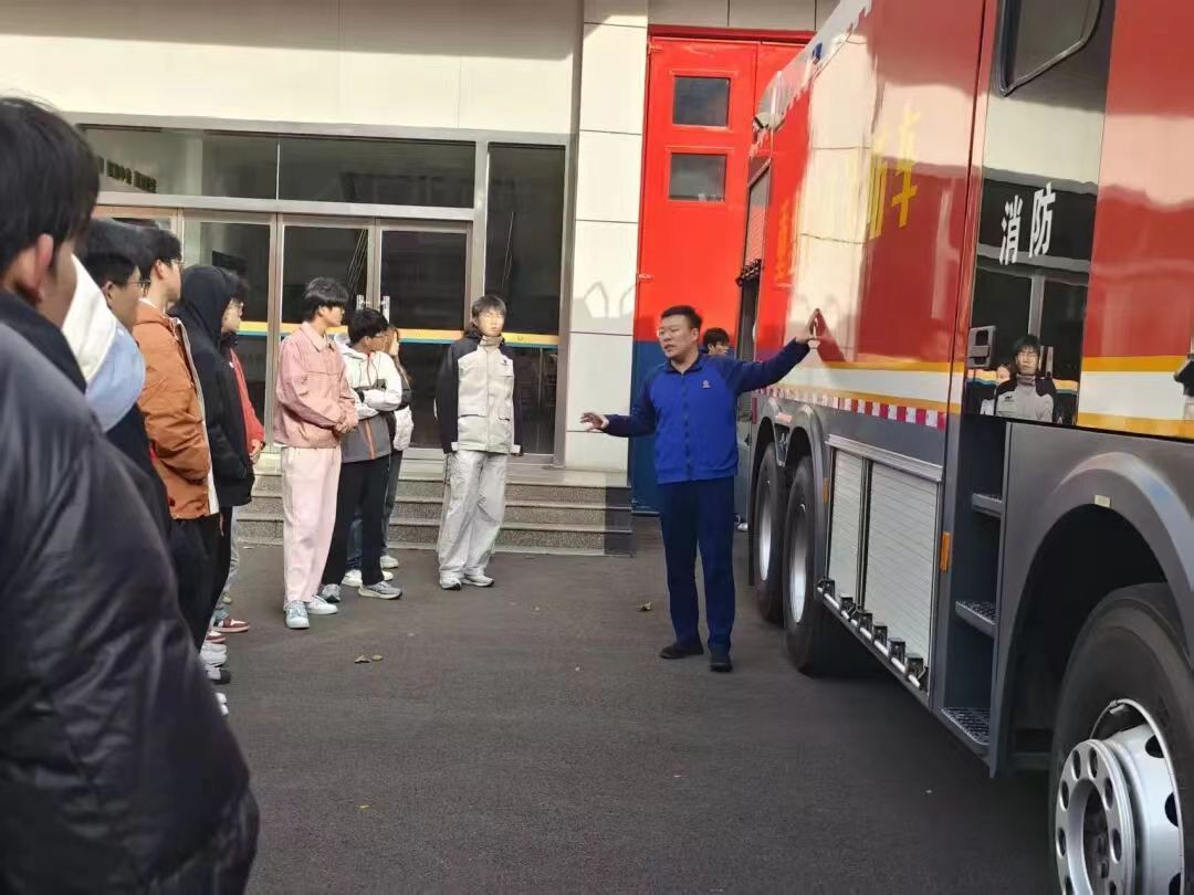 活动现场,消防员结合真实案例,详细讲解了灭火器、消防水带、防毒面具等各类消防器材的功能特点与操作步骤,并通过“演示+实操”的方式,指导学生们体验器材使用流程,让学生对消防装备有了更直观的认识,也深刻感受到消防工作的专业性与严谨性,他们在消防员的引导下参观了消防车库。当红色的消防车车门缓缓拉开,各类装备展现在眼前:能破拆钢筋的液压剪扩器、可深入狭小空间的救援担架、重达数十斤的隔热服等。“这套灭火防护服全套重达30斤,我们出警时要在1分钟内完成穿戴。”消防员边展示边介绍,学生们伸手触摸厚重的装备,真切感受到“火焰蓝”背后的负重与坚守。 活动尾声,学生们与消防员合影留念。